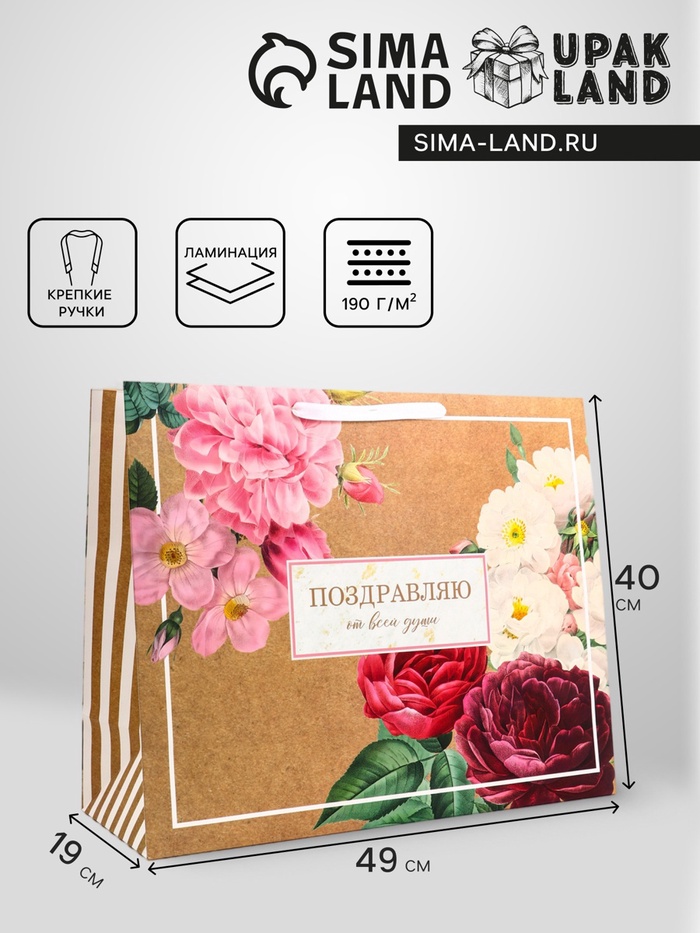 Пакет подарочный горизонтальный Поздравляю от всей души», 49×40×19 см