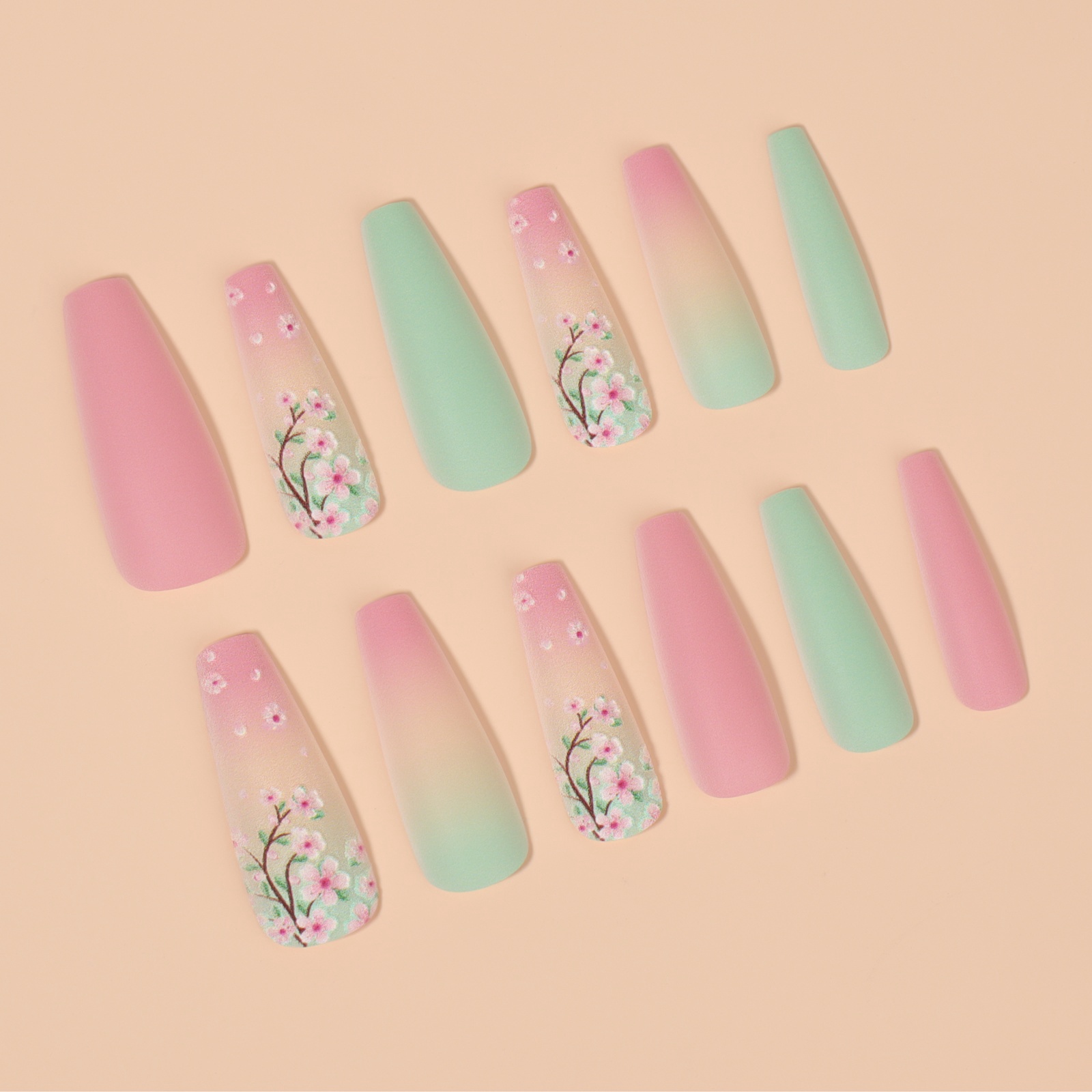 Накладные ногти «Сакура», 12 шт, с клеевыми пластинами, форма балерина, розовые, зелёные