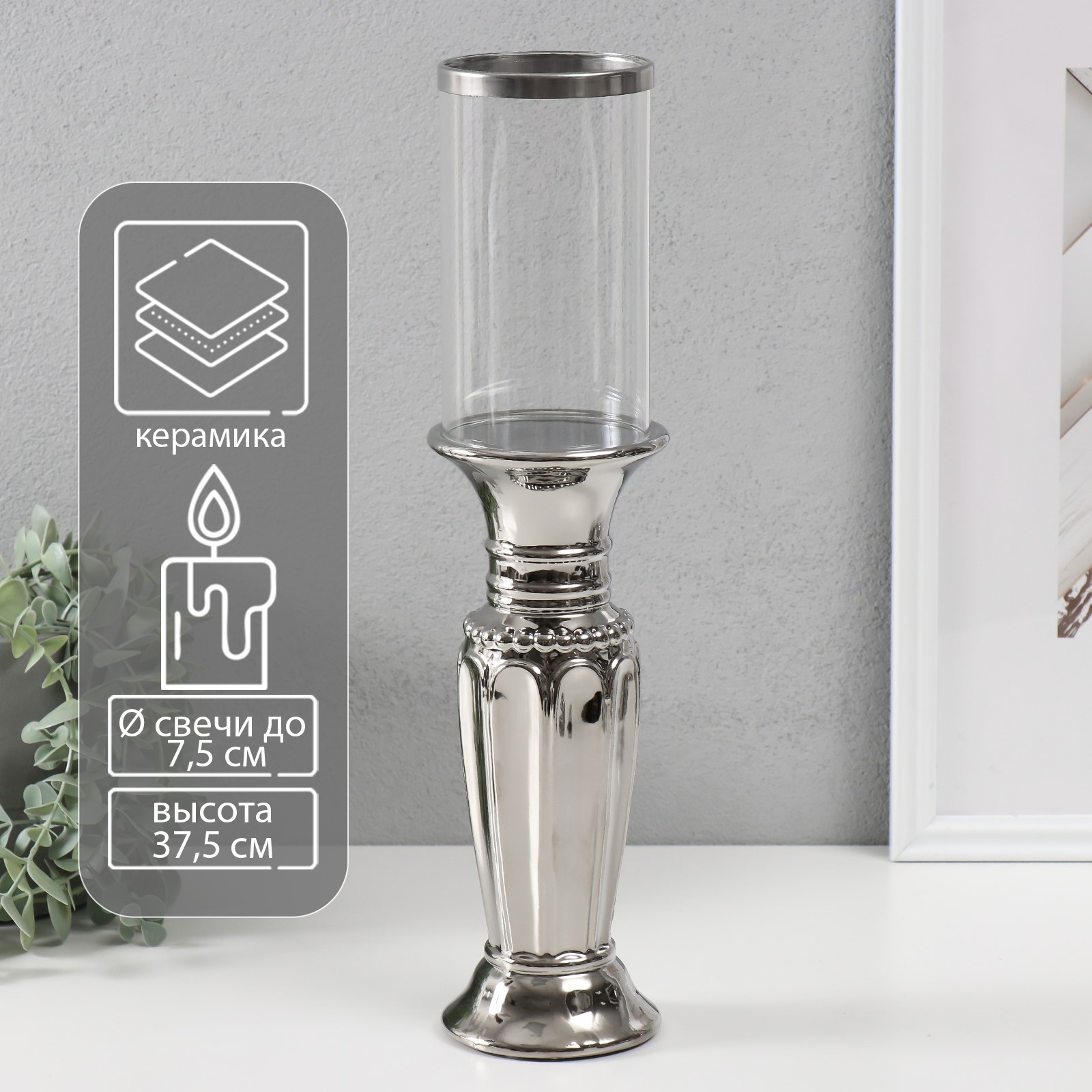 Подсвечник керамика, стекло на 1 свечу Арте d=7,5 см серебро 9х9х37,5 см