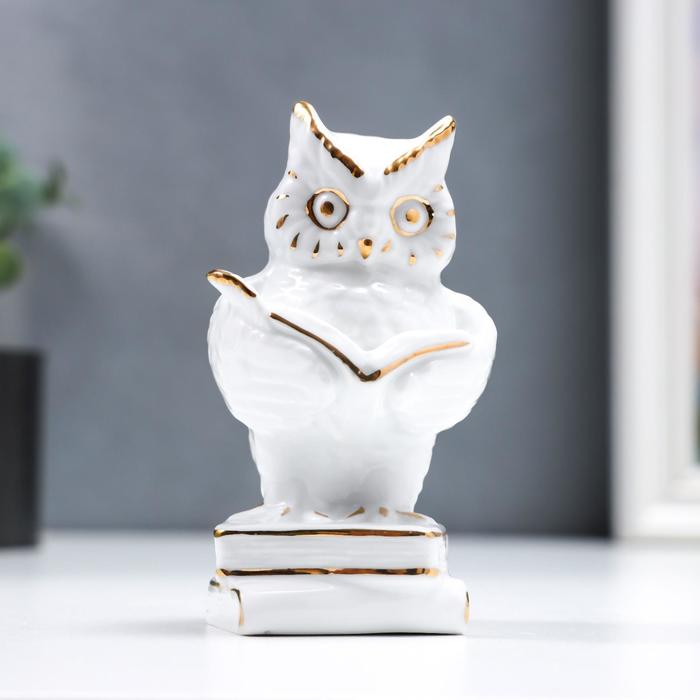 Фигурка керамика «Филин с книгой, на книгах», белый с золотом, 12 см