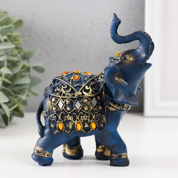 Фигурка полистоун «Синий слон в попоне с золотым узором и зеркалами», 14×7×11 см