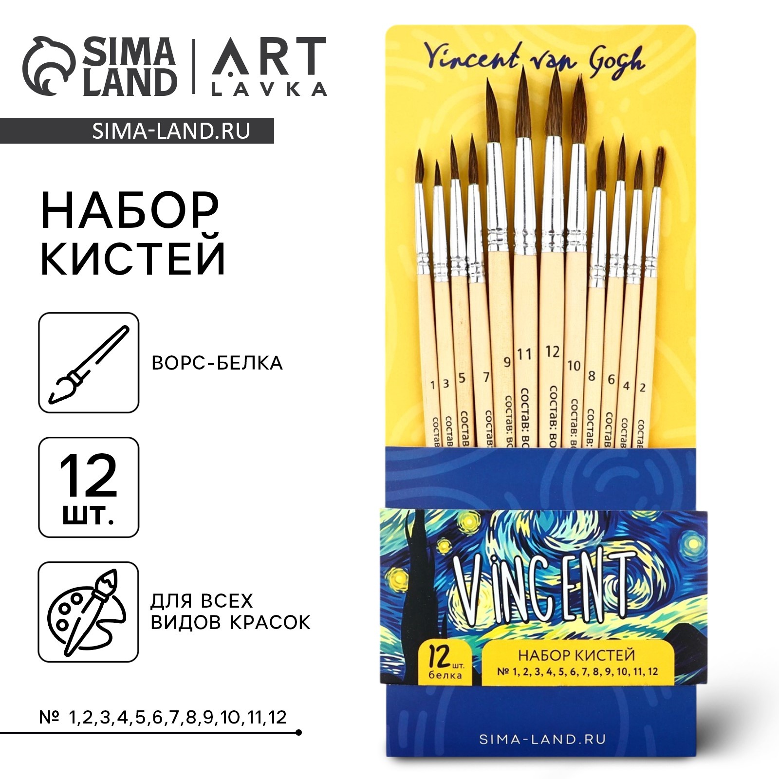 Набор кистей белка Живу ради искусства 12 шт, № 1, 2, 3, 4, 5, 6, 7, 8, 9, 10, 11, 12