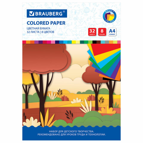 Цветная бумага А4 офсетная, 32 листа 8 цветов, на скобе, BRAUBERG, 200х280 мм, "Роща"