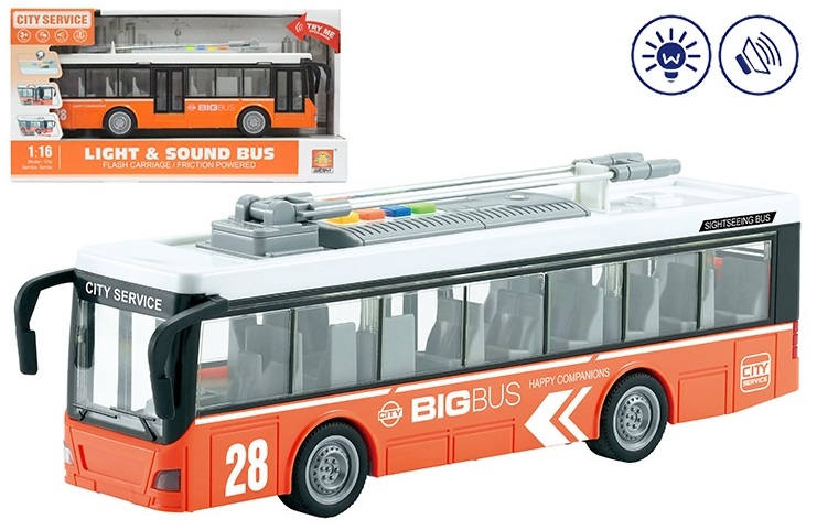 Машина 1:16 инерционная Троллейбус (свет,звук) оранжевый в