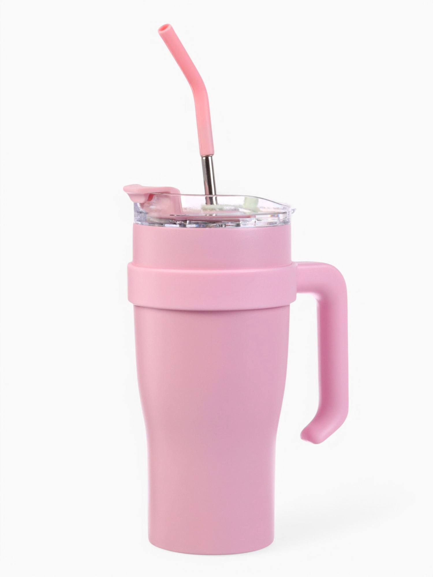 Термокружка 900 мл с трубочкой сохраняет тепло 6 ч нержавеющая розовая
