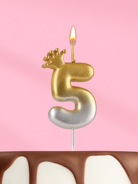 Свеча в торт С короной, цифра 5, золото - серебро