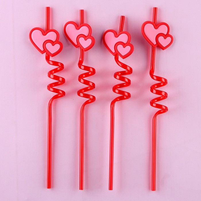 Трубочки для коктейля пластиковые Сердца в наборе 4 штуки