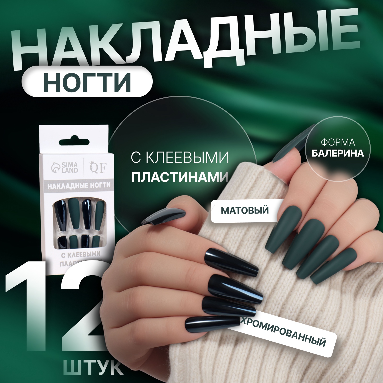Накладные ногти, 12 шт., с клеевыми пластинами форма балерина матовые/хромированные тёмно-зелёные