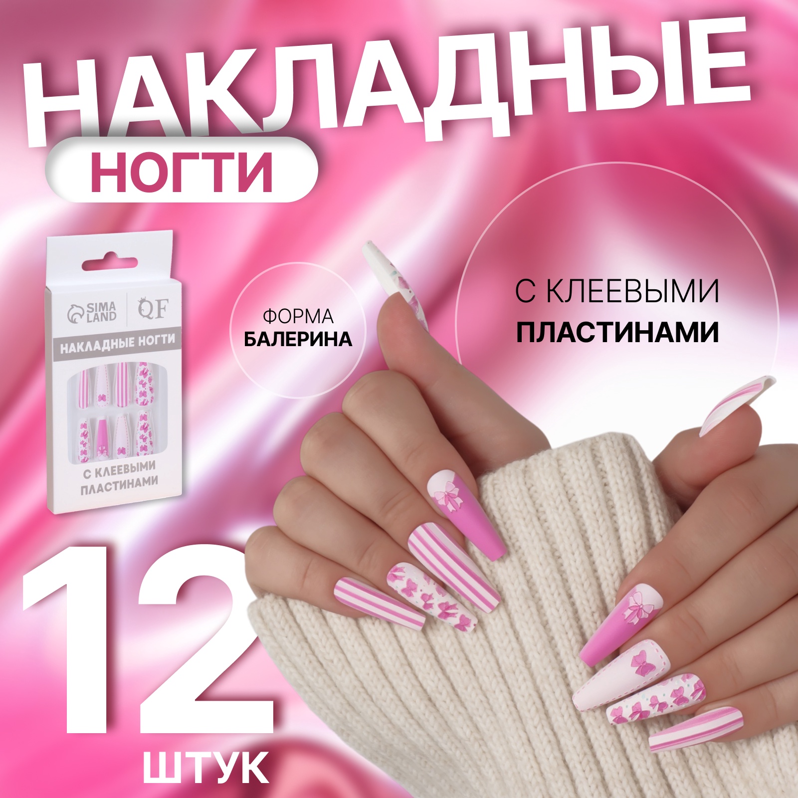 Накладные ногти Бантики 12 шт с клеевыми пластинами форма балерина белые розовые