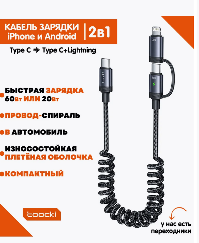 Кабель type-c для быстрой зарядки iphone с адаптером спираль